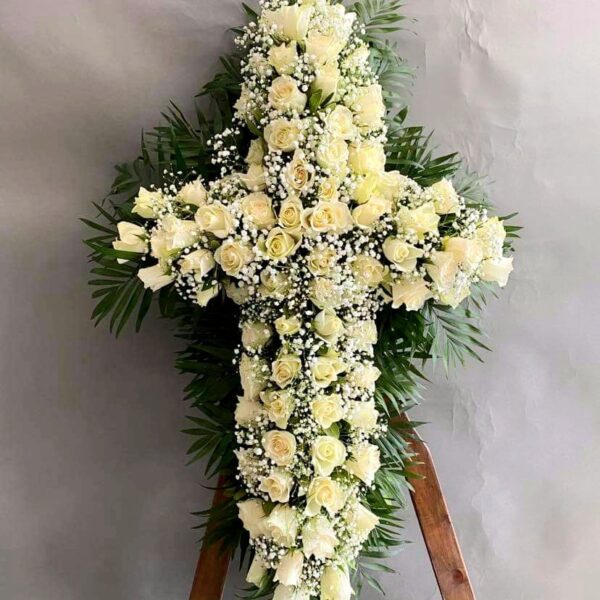 Funeral Cross with Roses Arrangement– A Fresh Tribute for a Final Farewell
