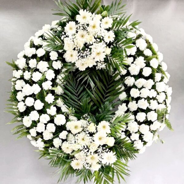 All wreaths from www.stefanikidias.gr are made with fresh seasonal flowers in white tones, conveying peace and dignity. We also include greenery, fern, and gypsophila, creating a complete and harmonious composition that expresses genuine honor and support to the bereaved family.